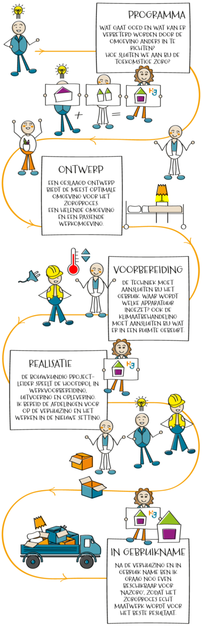 Als projectleider vernieuwing begeleid ik (ver)bouwprojecten in zorginstellingen. Mijn drijfveren zijn het werkplezier van zorgmedewerkers en een goede ervaring voor de patiënt. Vanuit mijn kennis van en ervaring met zorgprocessen, stel ik de juiste vragen om de nieuwe plek geschikt te maken voor het zorgproces. Vanuit mijn achtergrond in de bouw kan ik de vertaalslag maken naar de architect, installateur en aannemer. Het proces faciliteren en bewaken, dat is wat ik doe. Samenwerken doe ik vanuit betrokkenheid en vertrouwen, want bouwen doe je als een team.